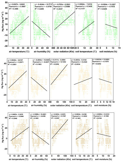 In the present investigation, in order to clarify the mechanism of Hg emissions for the three treatments, linear regression and Spearman correlation analyses between the Hg flux values and the meteorological parameters were derived (Figure 5, Table 4). The results revealed that higher Hg emission levels were observed when the solar radiation and air/soil temperature levels were high under all the examined conditions. In addition, negative correlations between the air/soil humidity and the Hg fluxes were observed in this study. However, it was determined that solar radiation was the most important factor influencing the Hg exchange fluxes under all the examined conditions (R2 = 0.4337 to 0.5307). The second most important factor was air temperature (R2 = 0.2548 to 0.3561). Those findings were in agreement with the results of previous studies [32]. Generally speaking, the increased humidity corresponded well with the decreasing solar radiation and temperature levels. However, a positive correlation between the soil moisture and the Hg fluxes has been noted in previous studies [38,39].