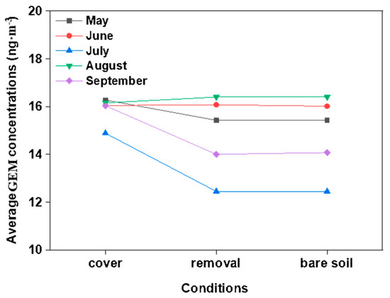 The monthly mean daily GEM concentrations in the ambient air above the vegetation coverage/removal and bare soil were 14.9 ± 6.3 to 16.3 ± 6.5; 12.4 ± 3.6 to 16.4 ± 5.6; and 12.4 ± 3.6 to 16.4 ± 5.6 ng·m−3, respectively (Table 1), and had ranged between 4.0 and 30.0 ng·m−3. The peak value of 16.4 ± 5.6 ng·m−3 in and valley value of 12.4 ± 3.6 ng·m−3, respectively, occurred during the months of July and August, under the vegetation removal and bare soil conditions, respectively. Significant differences in the GEM concentrations in the ambient air between vegetation coverage and the removal were observed (p < 0.05). For example, when the vegetation was removed, the GEM concentrations showed substantial seasonal variations (p < 0.05). The GEM concentrations were generally higher than background levels for the northern hemisphere, which is considered to be approximately 1.5 ng·m−3.