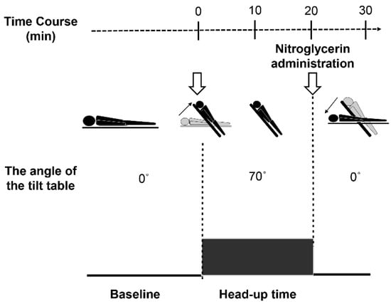 The HUTT was performed as previously described [6]. All study patients were admitted to our hospital a day before the test. We performed the test in the morning after sufficient night rest. The tilt table was set to a standing position at 70 degrees (70°). The patient initially lay on the table and wore belts to prevent accidental injury if syncope occurred. We then placed a continuous blood pressure monitoring and ECG electrode patch on the patient, using the tilt test monitoring device developed by Nihon Koden (Nihon Kohden, Tokyo, Japan). Blood pressure, heart rate, and ECGs were monitored continuously. The room light and air conditioner were turned off during the test. After confirming that the patient was in a stable condition with his/her security belts on, we moved up the study patient to 70°. The patient was instructed to stand for 20 min before administering nitroglycerin sublingually. Afterwards, the patient was instructed to stand for another 10 min. When the patient complained of presyncopal symptoms or developed syncope, we defined the HUTT result as positive. If syncope occurred, the tilt bed was leveled immediately, and vital signs were maintained. The protocol of the HUTT is shown in Figure 1.