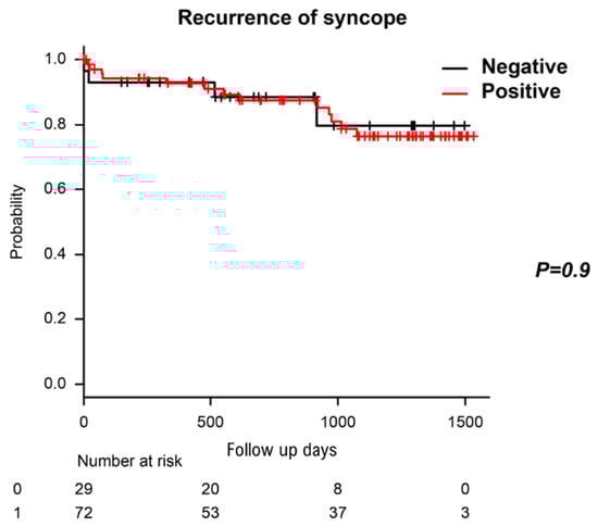 The patients were followed up for 886.1 ± 457.7 days (interquartile range: 518–1293 days). The recurrence rate of syncope was 16.9%, and there was no significant difference between the two groups in recurrence rate (13.8% vs. 18.1%, p = 0.772, Figure 3). We performed log-rank analysis and found no significant difference between the two groups (p = 0.772).