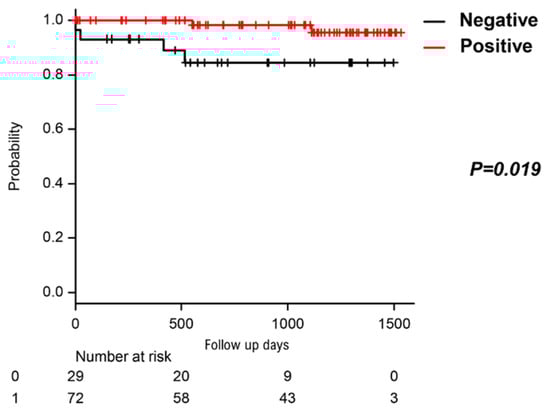 Regular follow-up of patients revealed six unexpected cardiac events (5.9%). Four out of 29 (13.9%) patients in the negative HUTT group and two out of 72 (2.8%) in the positive HUTT group experienced cardiac events. Of the four patients in the negative HUTT group, one patient required a pacemaker implantation due to an advanced atrioventricular conduction block. One patient required an implantable cardioverter defibrillator for syncope associated with ventricular tachycardia due to possible sarcoidosis. One patient underwent catheter ablation for AF with a rapid ventricular response (RVR). Sudden death occurred in the last patient 417 days after the HUTT. Among the two patients in the positive HUTT group, one patient required pacemaker implantation due to sick sinus syndrome, and the other required hospital admission because of AF with RVR. Details of all events are listed in Table 3. We performed log-rank analysis and found significant differences in the occurrence rate of cardiac events between the two groups (p = 0.019, Figure 4).