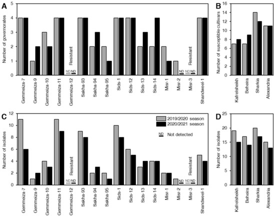 During the 2019/2020 season, the highest number of isolates was recorded for Gemmeiza-7 and Gemmeiza-11, followed by Sids-1 and Sakha-93, respectively, whereas during the 2020/2021 season, the highest number of isolates was recorded for Gemmeiza-11, followed by Sakha-93, Sids-1, and Gemmeiza-7, respectively (Figure 1C). In both seasons, the highest number of isolates was recorded on samples collected from the Sharkia governorate, followed by Kafrelsheikh, Beheira, and Alexandria, respectively (Figure 1D).