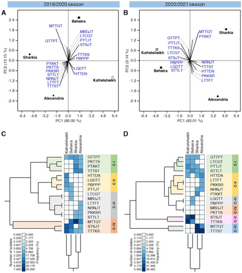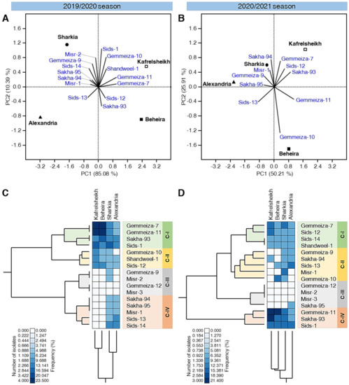 Additionally, standardized two-way hierarchical cluster analysis (HCA) was used to differentiate the individual cultivars among the studied location based on the number of isolates and frequency (Figure 2C,D). The differences in the isolates’ number and frequency are also visualized and presented as a heat map. In both seasons, the total HCA dendrogram among locations/governorates (presented at the bottom of Figure 2C,D) showed that the cultivar profiles of Kafrelsheikh were closer to the profile of Beheira, whereas that of Sharkia was closer to that of Alexandria.