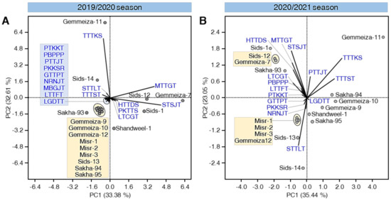 It worth mentioning that Gemmeiza-9, Gemmeiza-10, Gemmeiza-12, Misr-1, Misr-2, Misr-3, Sids-13, Sakha-94, and Sakha-95 were clustered together in the negative quarter of the scatter plot during the 2019/2020 season (Figure 4A). However, only Gemmeiza-12, Misr-1, Misr-2, and Misr-3 were clustered together in the same part of the graph during the 2020/2021 season (Figure 4B).