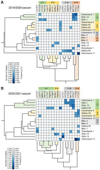 Furthermore, standardized two-way HCA was used to differentiate the individual physiological races of P. triticina among the studied cultivars based on the number of isolates and frequency (Figure 5A,B). The differences in the isolates’ number and frequency are also visualized and are presented as a heat map. In both seasons, Gemmeiza-7, Sids-12, and Sids-1 were clustered together (C-I) which appeared to have a higher frequency of the physiological races MTTGT and STSJT (Figure 5A,B). However, Sakha-93 was also clustered with C-I during the 2020/2021 season (Figure 5B). Likewise, Gemmeiza-9, Sakha-94, and Gemmeiza-10 were clustered together, within C-II, which appeared to be associated with the pathotype TTTST in both seasons. Nevertheless, Sakha-95 was also clustered with C-II during the 2019/2020 season (Figure 5B). Additionally, the resistant cultivars Gemmeiza-12 and Misr-3 were cluster together with C-III during both seasons.
