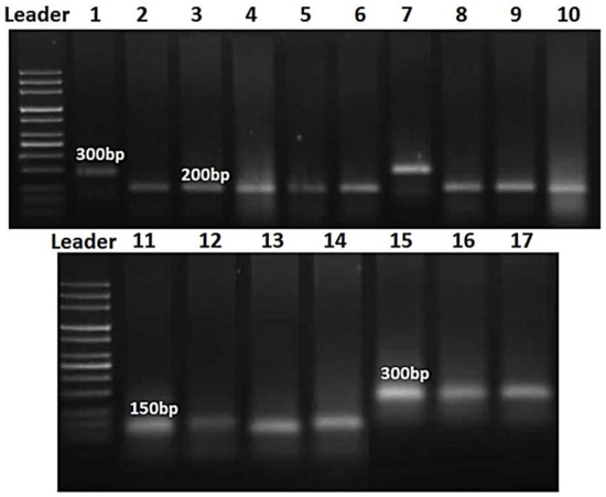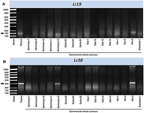 Sixteen wheat cultivars and two resistant lines (Lr genes) Lr19 and Lr28 were selected for the identification of resistance genes using molecular markers. Briefly, two specific primers were used to detect two resistance genes (Figure 8). The markers for Lr19 and Lr28 were defined as 150 bp and 300 bp fragments, respectively, in two wheat cultivars (Gemmeiza-12, and Misr-3) during the polymorphic survey, while fourteen of the tested cultivars did not show the presence of Lr19 (Figure 8A) and Lr28 (Figure 8B). These findings might explain the molecular mechanism(s) behind the previous results that the two cultivars, Gemmeiza-12 and Misr-3, are resistant to all races of leaf rust pathogen.
