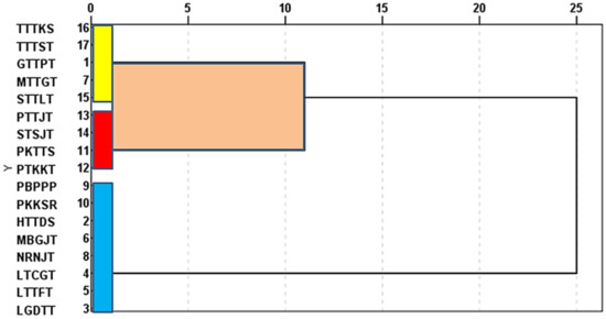 The races were split into two major clusters (Figure 6 and Figure 7), the first of which was further divided into two sub-clusters. At 300 bp, the first sub-cluster contained the races GTTPT, MTTGT, STTLT, TTTKS, and TTTST, while the second sub-cluster included PKTTS, PTKKT, PTTJT and STSJT at 150 bp. HTTDS, LGDTT, LTCGT, LTTFT, MBGJT, NRNJT, PBPPP, and PKKSR were part of the second cluster, which was split into one more sub-cluster at 200 bp.