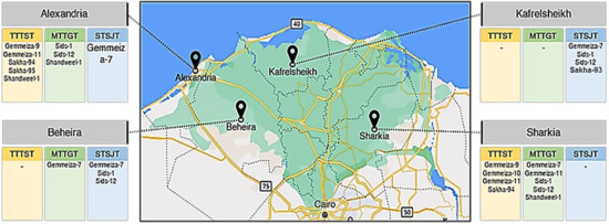 In the 2019/2020 season, the most frequent race, MTTGT (Table 5), was recorded in the Sharkia, Beheira, and Alexandria governorates, but not Kafrelsheikh. However, this race was reported only in Sharkia and Alexandria, but neither the Beheira nor Kafrelsheikh governorates during the 2020/2021 season (Table 5). Besides, the second frequent race, STSJT, was recorded in Kafrelsheikh, Beheira, and Alexandria, but not Sharkia during the 2019/2020 season. Nevertheless, during the 2020/2021 season, STSJT was only reported in samples collected from Kafrelsheikh and Beheira, but neither Alexandria nor Sharkia (Table 5). Moreover, the third most frequent race, TTTKS, was identified from all studied locations during the 2019/2020 season; however, it was reported only from Kafrelsheikh and Beheira, but neither the Alexandria nor Sharkia governorates during the 2020/2021 season (Table 5).