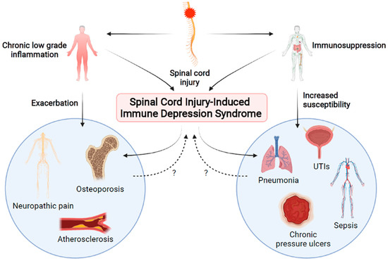 After spinal cord injury (SCI), both chronic systemic inflammation and immunosuppression result in SCI-induced immune depression syndrome (SCI-IDS). Altered immune function results in increased susceptibility to infection and exacerbated secondary complications of SCI. In turn, these secondary complications and infections may create a feedback loop which amplifies immune dysfunction. Created using BioRender.com accessed on 2 September 2021.