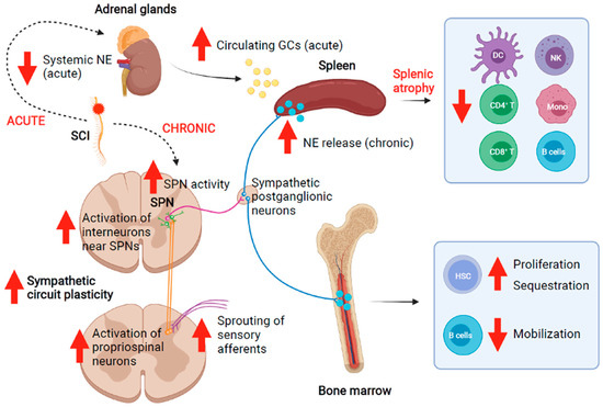 After a SCI, there is an acute drop in systemic norepinephrine (NE) and an increase in plasma glucocorticoids (GCs) released by the adrenal glands. Chronically, increased neural circuit plasticity results in sympathetic hyperreflexia and release of NE by sympathetic post-ganglionic neurons, including those targeting the spleen and other lymphoid organs such as the bone marrow. These changes after SCI result in measurable altered immune profile and function. Created using BioRender.com accessed on 2 September 2021.