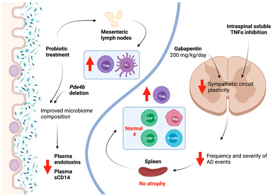 Preclinical studies have revealed that pharmacological inhibition of sympathetic circuit plasticity, either through the use of high-dose gabapentin (GBP) or soluble TNFα inhibition, can reduce autonomic dysreflexia (AD) and improve splenic immune cell profile. Separately, studies have examined the modulation of gut microbiota, either through probiotic treatment or deletion of Pde4b, to improve microbiome composition after SCI, which in turn improves anti-inflammatory immune cell profile in gut-associated lymphoid tissues (GALTs), like mesenteric lymph nodes (MLNs), and reduces circulating markers of inflammation. Created using BioRender.com accessed on 2 September 2021.