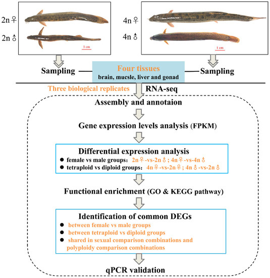 Loaches for sampling were collected from the Fisheries Experimental Station of Huazhong Agricultural University. A total of 100 loaches were separately selected from previously established 18-month-old diploid and tetraploid loach populations. The ploidy of fish was determined by flow cytometry analysis as previously described [33], and Paramisgurnus dabryanus, which is a known diploid, was used as a control (Figure S1). Forty-eight healthy loaches (24 diploids and 24 tetraploids, containing both females and males) were randomly selected and acclimatized in two tanks with adequate aeration at 24–26 °C for one week before processing. Four tissues (brain, gonad, liver and muscle) of female and male of diploid and tetraploid individuals were immediately sampled separately. Total RNA from each sample was isolated using RNAiso Plus (TaKaRa, Dalian, China) according to the manufacturer’s instructions. RNA quality and concentration were determined using an Agilent Bioanalyzer 2100 (Agilent Technologies, Santa Clara, CA, USA) and Qubit® RNA Assay Kit in Qubit® 2.0 Fluorometer (Life Technologies, Carlsbad, CA, USA), respectively. High-quality RNA was subjected to further libraries construction.