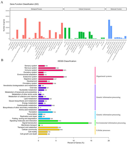 Before de novo transcriptome assembly, paired-end raw reads were processed to remove adapter fragments and low-quality bases, generating clean reads from raw reads. As shown in Table S2, the raw reads, clean reads, clean bases, Q20, Q30, and the GC content were recorded for 48 libraries. For all libraries, Q20 ≥ 90%, and Q30 ≥ 89%, showing the high-quality of the sequencing data and, thus, could be used for subsequent analyses. After using the Trinity software, de novo sequence assembly resulted in 351,696 unigenes with 956 bp N50 and an average length of 791 bp ranging from 301 bp to 42,939 bp (Tables S3 and S4). The number of unigenes and their length distribution indicated that 68,606 unigenes were >1000 bp in length (Table S3). The functions of unigenes were annotated using GO and KEGG databases. According to GO annotations, the unigenes were involved in 25 biological processes, 16 cell components, and 9 molecular functions (Figure 2A). These unigenes participated in 32 KEGG pathways (Figure 2B).