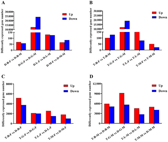 To characterize the differences between tetraploid and diploid loaches, the transcriptional levels of the brain, gonad, liver, and muscle tissues of tetraploids and diploids of the same sex were compared. Among the comparisons of tetraploid and diploid female loaches (brain, gonad, liver, and muscle samples from tetraploid females were compared with those from diploid females, and comparisons were named T-B-F vs. D-B-F, T-G-F vs. D-G-F, T-L-F vs. D-L-F, and T-M-F vs. D-M-F, respectively), a total of 8913 (5156 upregulated and 3757 downregulated), 4136 (2114 upregulated and 2022 downregulated), 4069 (2563 upregulated and 1506 downregulated) and 2832 (1820 upregulated and 1012 downregulated) DEGs were identified in brain, gonad, liver, and muscle tissues, respectively (Figure 3C). Among the comparisons of tetraploid and diploid male loaches (T-B-M vs. D-B-M, T-G-M vs. D-G-M, T-L-M vs. D-L-M, and T-M-M vs. D-M-M represent the comparison of brain, gonad, liver, and muscle samples between tetraploid and diploid males, respectively), a total of 11,014 (5931 upregulated and 5083 downregulated), 14,868 (9173 upregulated and 5675 downregulated), 7307 (4559 upregulated and 2748 downregulated), and 9090 (5000 upregulated and 4090 downregulated) DEGs were identified in the brain, gonad, liver, and muscle tissues, respectively (Figure 3D).