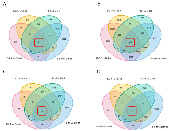 Venn diagram of shared and unique DEGs in brain (A), gonad (B), liver (C), and muscle (D) of four comparison groups. The red box indicates the number of DEGs overlapping among the four comparison groups.