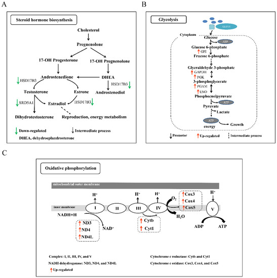 The schematic diagram of key pathways. (A) Steroid hormone biosynthesis. Note: HSD17B3, hydroxysteroid 17-beta dehydrogenase 3; SRD5A1, 3-oxo-5-alpha-steroid 4-dehydrogenase 1; DHEA, dehydroepiandrosterone. (B) Glycolysis. Note: GPI, glucose-6-phosphate isomerase; GAPDH, glyceraldehyde 3-phosphate dehydrogenase; PGK, phosphoglycerate kinase; PGAM, 2,3-bisphosph-oglycerate-dependent phosphoglycerate mutase; ENO, enolase. (C) Oxidative phosphorylation pathway. Note: I, II, III, IV, and V represent different complexes. ND3/4/4L, NADH-ubiquinone oxidoreductase chain 3/4/4L; Cytb/1, ubiquinol-cytochrome c reductase cytochrome b/1; Cox3/4/5, cytochrome c oxidase subunit 3/4/5. The green arrow represents the downregulated, and the dotted arrow represents the intermediate process. The black and red arrow represents the promotor and upregulated DEGs, respectively.