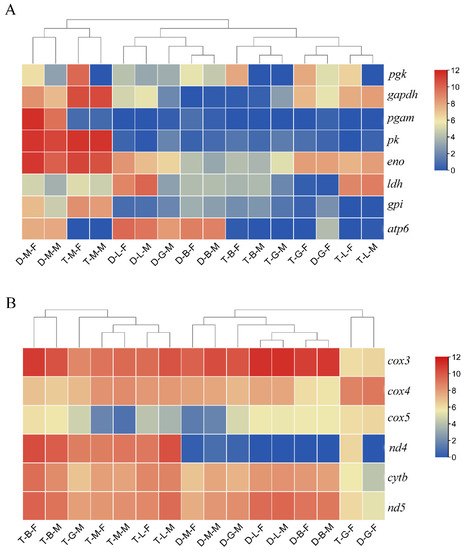 In addition, in order to reveal the pathways regulating polyploid growth dimorphism, we selected the growth-related pathways enriched by the DEGs in T-B/G/L/M-F vs. D-B/G/L/M-F and T-B/G/L/M-M vs. D-B/G/L/M-M for analysis. According to the results of KEGG pathway enrichment analysis, most of the DEGs identified in the four tissues in the comparison of tetraploid and diploid females (T-B/G/L/M-F vs. D-B/G/L/M-F) were significantly enriched in the oxidative phosphorylation pathway (Table 1). Most of the genes (NADH-ubiquinone oxidoreductase chain 3 (nd3), nd4, nd4l, cytb, cytochrome c oxidase subunit 3 (cox3), cox4, and cox5) exhibited higher expression in tetraploids than in diploids (Figure 5C and Figure 6B), whereas the expression of the DEGs related to steroid hormone biosynthesis and fatty acid degradation pathways was generally lower in tetraploids than in diploids. Similarly, in the comparison of tetraploid and diploid males (T-B/G/L/M-M vs. D-B/G/L/M-M) in multiple tissues, DEGs that were relatively highly expressed in tetraploid males were also significantly enriched in oxidative phosphorylation and glycolysis pathways, while those with lower expression in tetraploid males were mainly enriched in steroid hormone synthesis (Table 1). A heat-map was constructed by filtering some key genes related to glycolysis and oxidative phosphorylation pathways, and the results showed that genes related to glycolysis had high expression levels in both diploid and tetraploid muscle tissues, while most of the genes related to oxidative phosphorylation had high expression levels in multiple tissues (Figure 6).