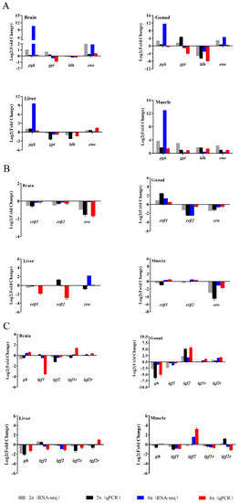 Comparison of the expression profiles of genes involved in the glycolytic pathway. (A) Three estrogen receptor genes (B) and several reported growth-related genes (C) determined by RNA-seq and qPCR in four tissues of female loaches. Each bar represents the expression fold change in a gene compared to that in the male loaches.