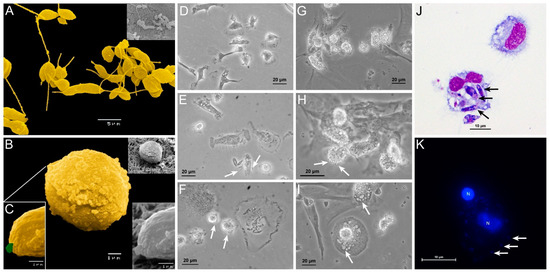 Canine blood-MØs and KCs exposed to L. infantum virulent promastigotes or axenic amastigotes. L. infantum virulent promastigotes (yellow) showing elongated flagellum characteristic of L. infantum metacyclic promastigotes (A) and axenic amastigotes (B) with a characteristic oval body (yellow) and residual flagella (C) (green) were observed under SEM. The acquired images were artificially colored. Blood-MØs (uninfected-D) were exposed to virulent promastigotes for 3 h (E) and 5 h (F). Interaction of promastigotes with the MØ membrane can be observed (white arrows) along with parasite internalization (E,F). Uninfected KCs (G) and KCs exposed to axenic L. infantum amastigotes for 1.5 h (H) and 5 h (I). Internalization of amastigotes by KCs (white arrows) can be observed (I). Blood-MØs exposed to virulent L. infantum promastigotes for 3 h stained with Hemacolor staining kit were observed by optical microscopy (magnification 1000×) (J). Black arrows indicate promastigote internalization. KCs exposed to L. infantum amastigotes for 3 h and stained with DAPI (K) (blue) were observed by fluorescence microscopy. Acquired images show parasites binding to the KCs membrane. N-KCs nucleus.