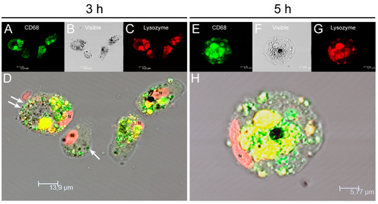 Internalization of L. infantum parasites by canine KCs. After 3 h (A–D) and 5 h (E–H) of exposure to L. infantum GFP amastigotes (white arrows), KCs were stained for CD68 (green), lysozyme (red) and nucleus (N) and fluorescent and visible light images were acquired. Co-localization of CD68 and lysozyme in lysosomal compartments (yellow) can be observed in overlapping images (D,H). CD68 and lysozyme accumulation can be noticed at 5 h of parasite exposure (H).