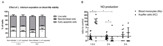 Viability of canine blood-MØs and nitric oxide (NO) production by KCs and blood-MØs exposed to L. infantum. The viability of blood-MØs was assessed by flow cytometry with annexin-V and propidium iodide staining (A). Data are represented by stacked bars showing mean and standard deviation (n = 6). Results of NO production by blood-MØs exposed to virulent promastigotes and KCs exposed to axenic amastigotes were normalized to non-infected cells (B). Individual values are indicated as black dots (blood-MØs) and black triangles (KCs) with mean and standard deviation (n = 10). Non-parametric Wilcoxon test was used for statistical comparisons. * (p < 0.05) indicate significant differences.