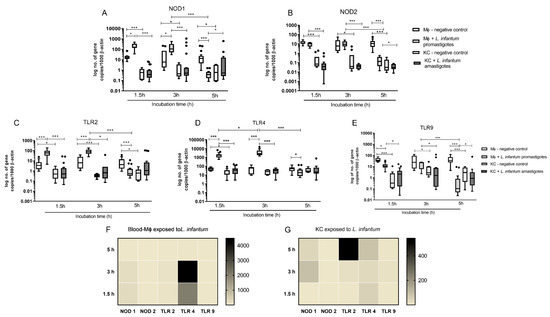Gene expression of innate immune receptors in L. infantum infected KCs and blood-MØ. Blood-MØs were exposed to promastigotes and KCs to amastigotes. The number of copies of NOD1 (A), NOD2 (B), TLR2 (C), TLR4 (D), and TLR9 (E) mRNA was determined by real-time PCR at 1.5 h, 3 h, and 5 h of parasite exposure. Results are expressed by whisker box-plot (Tukey). Outlier values are indicated by black dots. The non-parametric Wilcoxon test was used for statistical comparisons (n = 10). * (p < 0.05) and *** (p < 0.0001) indicate significant differences. Heat maps represent the mRNA accumulation of innate sensors by blood-MØs (F) and KCs (G) during parasite exposure.