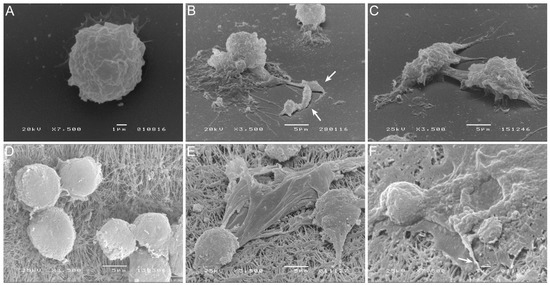 Blood-MØs phagocyting promastigotes and KCs emitting extracellular traps (ETs) in response to L. infantum. Uninfected blood-MØs (A) and blood-MØs exposed to virulent L. infantum promastigotes for 3 h (B,C) were observed by SEM and images were acquired. White arrows point out fiber-like structures entrapping promastigotes. Uninfected KCs (D) and KCs releasing ETs after 5 h of incubation with L. infantum axenic amastigotes (E,F) can be observed. White arrows indicate a fiber-like structure and cytoplasm extravasation.