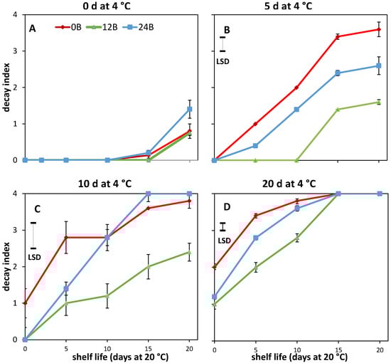 Average decay index with indicated standard error during shelf life (20 °C) for five red (R) tomatoes per cold storage duration. Red, green and blue symbols indicate cultivation at 0, 12 and 24% additional blue light, respectively. Tomatoes were either non-stored (A) or cold stored at 4 °C for 5 d (B), 10 d (C) or 20 d (D). LSD values, when present, are indicated per panel.
