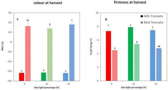 Average color at harvest (A), expressed as normalized anthocyanin index (NAI) and (B) firmness, expressed as FI index, at harvest of twenty-five MG (solid bars) and R tomatoes (dashed bars) with indicated standard error, respectively. Colors indicate tomatoes cultivated with 0 (red bars), 12 (green bars) and 24% (blue bars) additional blue light. The different letters in each panel indicate significant differences between light treatment.