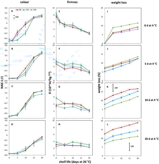 Average color, firmness and weight loss development of five MG tomatoes during shelf life at 20 °C after cold storage at 4 °C for 0 d (A,E,I) 5 d (B,F,J), 10 d (C,G,K) or 20 d (D,H,L) with indicated standard error, respectively. Colors indicate tomato cultivation with 0 (red symbols), 12 (green symbols) and 24% (blue symbols) additional blue light. LSD values, when present, are indicated per panel.