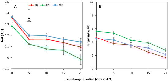 Average color development, expressed as NAI values (A), and average firmness development, expressed as FI index (B), for five red tomatoes during cold storage (4 °C), with indicated standard error. Red, green and blue symbols indicate cultivation with 0, 12 and 24% additional blue light, respectively. The LSD value in panel A indicates the presence of significant differences between light treatments.