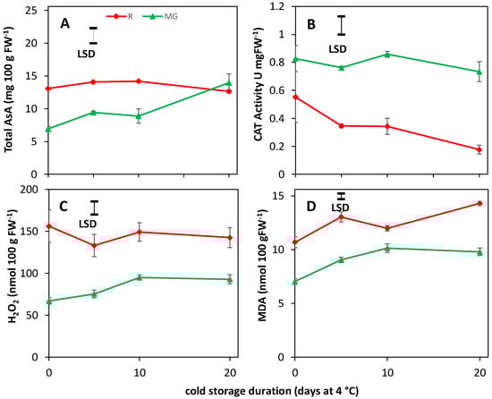 Changes in total AsA (A), CAT activity (B), H2O2 (C), and MDA (D) content at harvest and cold storage (4 °C) for fifteen MG (green symbols) and fifteen R tomatoes (red symbols). Light treatment effects were not significant and therefore values are shown only per maturity. LSD values are indicated per panel.