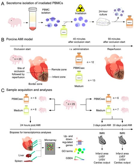 Background and experimental approach. (A) Porcine PBMCs were enriched, irradiated, and cultured for 24 h. Cells and cellular debris were removed and the supernatant containing the secretome was lyophilized. (B) Reperfused AMI was induced via balloon occlusion of the left anterior descending coronary artery (LAD) for a total duration of 90 min, followed by reperfusion. Forty minutes after starting the balloon inflation, the PBMCsec (n = 12 animals) or medium used for the PBMC culture (n = 13) were injected over 25 min. (C) For the in silico analyses, biopsies of infarcted, transition, and non-infarcted myocardium, as well as liver and spleen of the PBMCsec-treated (n = 6) and medium-treated pigs (n = 6), were obtained 24 h post AMI. Transcriptional analyses included the identification of up- and downregulated genes, Gene Ontology (GO) term analysis, and gene set enrichment analysis (GSEA). Cardiac performance was determined using functional magnetic resonance imaging (fMRI) 3 days and 30 days after the AMI and assessed in terms of infarct area, LVEF, LVSV, and cardiac output. fMRIs of the PBMCsec-treated (n = 6) and medium-treated (n = 7) pigs was performed 3 days and 30 days after the AMI. AMI: acute myocardial infarction, GO: gene ontology, GSEA: gene set enrichment analysis, i.v.: intravenous, fMRI: functional magnetic resonance imaging, LVEF: left ventricular ejection fraction, LVSV: left ventricular stroke volume, PBMCsec: secretome of stressed porcine peripheral blood mononuclear cells.