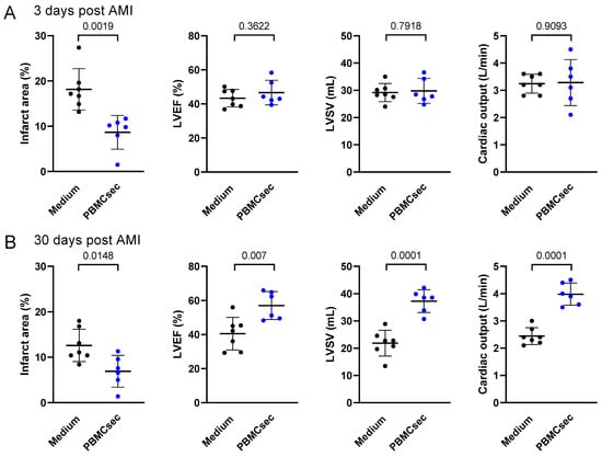 The PBMCsec promoted cardiac regeneration post AMI. Infarct area, LVEF, LVSV, and cardiac output of the medium-treated pigs (n = 7) and PBMCsec-treated pigs (n = 6) were assessed (A) 3 days and (B) 30 days after a LAD balloon occlusion. A two-sided t-test for unpaired samples was used to compare the groups. Numbers indicate p-values. LVEF: left ventricular ejection fraction, LVSV: left ventricular stroke volume.