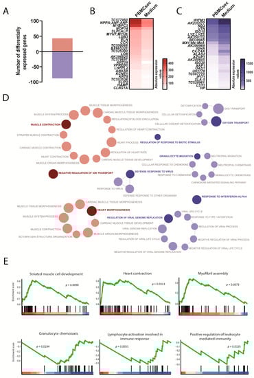 Transcriptional changes induced by the PBMCsec in the border zone between infarcted and remote myocardium. (A) Total numbers of differentially expressed genes. Red and blue indicate up- and downregulated genes, respectively, when comparing the PBMCsec versus the medium. The average fold change of n = 6 animals per group is shown. Absolute expression values of genes (B) up- and (C) downregulated by the PBMCsec compared with the medium. Colors indicate expression values. (D) GO terms associated with up- (red) and downregulated (blue) genes. Each circle represents one term. Circle sizes indicate p-values. Overarching terms within a group are highlighted in bold. (E) GSEA of up- (upper panel) and downregulated (lower panel) genes by the PBMCsec.