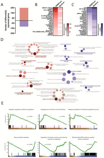 Transcriptional changes induced by the PBMCsec in the infarcted area. (A) Total numbers of differentially expressed genes. Red and blue indicate up- and downregulated genes, respectively, when comparing the PBMCsec versus the medium. The average fold change of n = 6 animals per group is shown. Absolute expression values of genes (B) up- and (C) downregulated by the PBMCsec compared with the medium. Colors indicate expression values. (D) GO terms associated with up- (red) and downregulated (blue) genes. Each circle represents one term. Circle sizes indicate p-values. Overarching terms within a group are highlighted in bold. (E) GSEA of up- (upper panel) and downregulated (lower panel) genes by the PBMCsec.