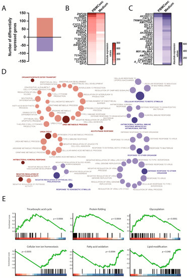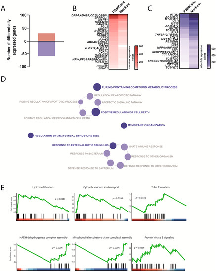 Transcriptional changes induced by the PBMCsec in the spleen. (A) Total numbers of differentially expressed genes. Red and blue indicate up- and downregulated genes, respectively, when comparing the PBMCsec versus the medium. The average fold change of n = 6 animals per group is shown. Absolute expression values of genes (B) up- and (C) downregulated by the PBMCsec compared with the medium. Colors indicate expression values. (D) GO terms associated with up- (red) and downregulated (blue) genes. Each circle represents one term. Circle sizes indicate p-values. Overarching terms within a group are highlighted in bold. (E) GSEA of up- (upper panel) and downregulated (lower panel) genes by the PBMCsec.