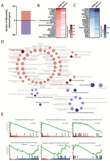 Transcriptional changes induced by the PBMCsec in the liver. (A) Total numbers of differentially expressed genes. Red and blue indicate up- and downregulated genes, respectively, when comparing the PBMCsec versus the medium. The average fold change of n = 6 animals per group is shown. Absolute expression values of genes (B) up- and (C) downregulated by the PBMCsec compared with the medium. Colors indicate expression values. (D) GO terms associated with up- (red) and downregulated (blue) genes. Each circle represents one term. Circle sizes indicate p-values. Overarching terms within a group are highlighted in bold. (E) GSEA of up- (upper panel and protein glycosylation in lower panel) and downregulated (two terms on lower left) genes by the PBMCsec.