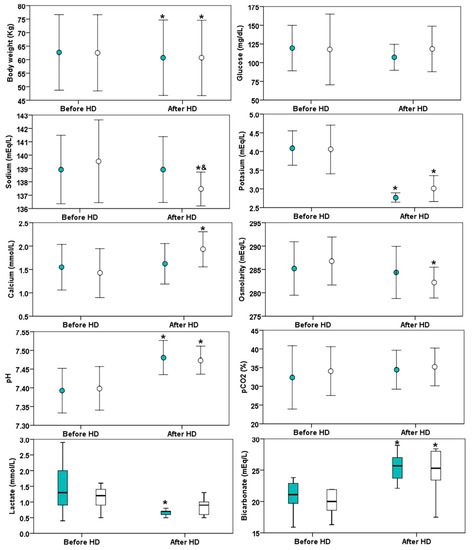 Biochemical parameters before and after hemodiafiltration (HDF) in 13 patients with different dialysate sodium profile: individualized indicated (green color markers) or fixed at 138 mmol/L (white markers). The asterisk (*) indicates p < 0.05 versus before HDF and the symbol & indicates p < 0.05 versus fixed sodium. The circle markers indicate mean values (± standard deviation) while the box plots indicate medians (horizontal line), interquartile range (box) and 1.5 time the interquartile range (error bars).