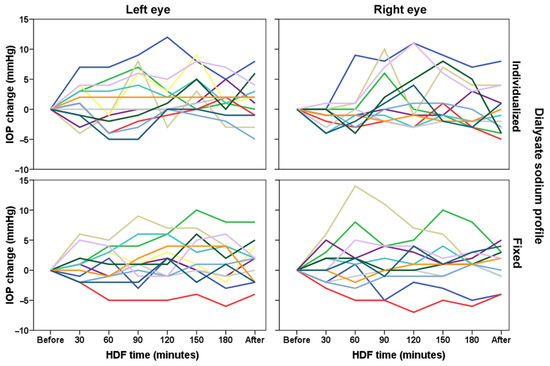 Individual values of intraocular pressure evaluated during hemodiafiltration (HDF) in 13 patients (each color indicates a different patient) with different dialysate sodium profile (individualized or fixed at 138 mmol/L).