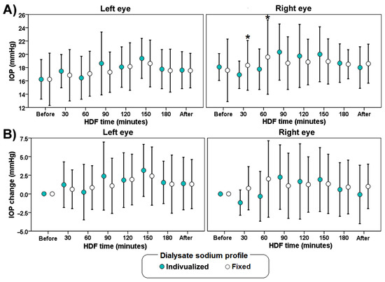 Average values of IOP (A) and IOP change (B) during hemodiafiltration (HDF) with different dialysate sodium profile (individualized or fixed at 138 mmol/L). The error bars indicate one standard deviation. The asterisk (*) indicates a significant difference (p < 0.05) versus measurements in the left eye.