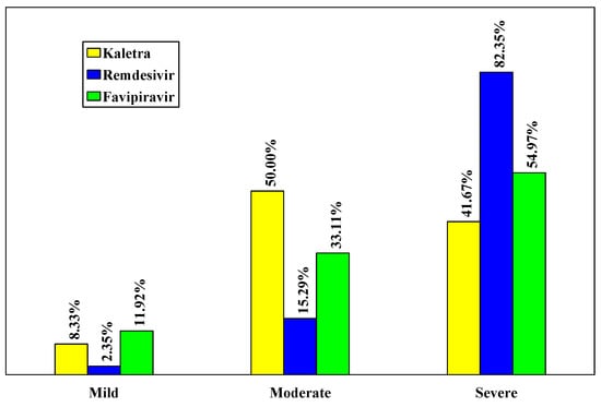 The severe form of the disease was found in 82.35% of patients from the Remdesivir batch, significantly higher than in the L/R and Favipiravir groups (41.67% and 54.97%, respectively, p < 0.001), (Table 2, Figure 1).