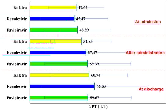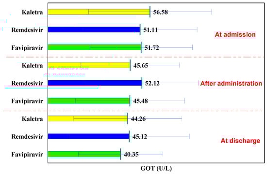 Thus, compared to the values at hospitalization, in the L/R and Favipiravir groups, the GOT values decreased insignificantly after administration (from 56.58 U/L to 45.65 U/L, p = 0.142 and from 51.72 U/L to 45.48 U/L, p = 0.066, respectively), further decreasing, so that, at discharge, the decrease in the case of Kaletra batch was insignificant (from 56.58 U/L to 44.26 U/L, p = 0.112), whereas the decrease in the Favipiravir batch was significant (from 51.72 U/L to 40.35 U/L, p < 0.001).