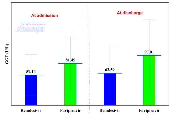 The normal laboratory GGT values are between 0 and 50 U/L. GGT values were recorded only in Remdesivir and Favipiravir groups, at hospitalization and at discharge. In both groups, the GGT increased insignificantly (from 59.14 U/L to 62.59 U/L in the Remdesivir group, p = 0.633 and in the case of Favipiravir from 81.45 U/L to 97.01 U/L, p = 0.437, respectively), (Table 5).