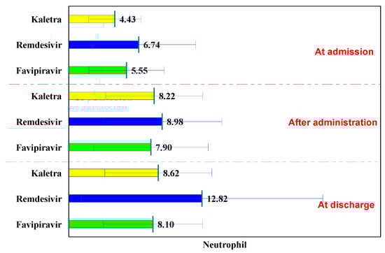 In the Favipiravir group, the values of neutrophils at hospitalization were 5.55 × 103/dL, after administration they increased significantly to 7.90 × 103/dL (p < 0.001), and at discharge the values were 8.10 × 103/dL < 0.001).
