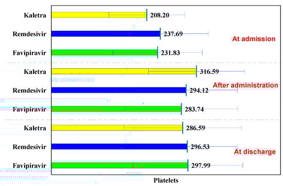 At hospitalization, after administration and at discharge, no significant differences were observed in all three groups in terms of platelet values (p > 0.05). The use of the three antiviral drugs did not cause thrombocytopenia (Figure 6).