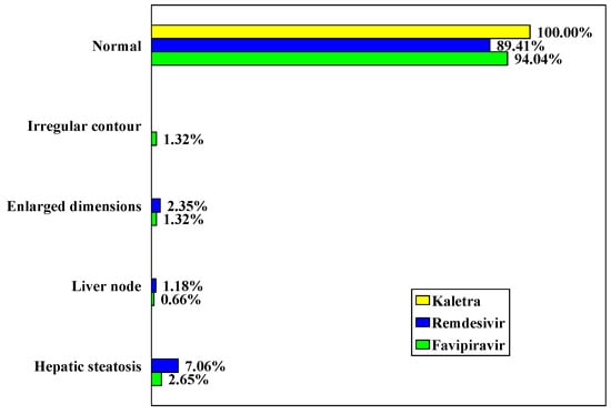Among the study group, 36 patients were treated with Lopinavir/Ritonavir (Kaletra) (L/R), 85 patients with Remdesivir, and 151 patients with Favipiravir. L/R treatment was subsequently withdrawn from the protocol of the Ministry of Health; there were also patients who refused to receive this treatment combination. Patients with significant pre-existing liver damage (chronic hepatitis with hepatocytolysis or severe cholestasis, liver cirrhosis, and liver metastases) were excluded from the study. The results of the computer tomography (CT) scan of the abdomen were also evaluated to rule out causes of liver damage.
