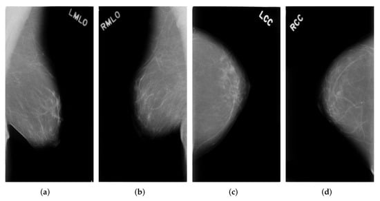 Four example mammograms of one breast (a) Left MLO view images (b) Right MLO view images (c) Left CC view images (d) Right CC view images.