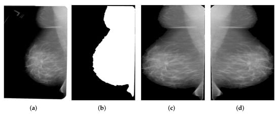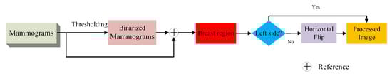 The purpose of pre-processing is to align the pectoral wall to the left side of the image and then extract the breast region for the following modules. The data flow of our proposed pre-processing framework can be seen in Figure 2.