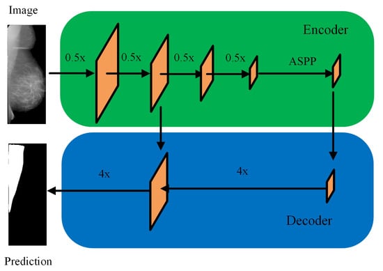 Compared to Unet and SegNet [24,25], Deeplabv3+ model has shown to be preferable given its performance [26,27]. As a result, in this study, we took Deeplabv3+ as the segmentation framework. Deeplabv3+ deploys an encoder-decoder structure that can simultaneously encode multi-scale contextual information and capture the boundaries of sharper objects when recovering the spatial information via decoder. The novelty of Deeplabv3+ is that depthwise separable convolution is embedded into the Atrous Spatial Pyramid Pooling (ASPP) and decoders module, where ASPP is the improved version of SPP with Atrous convolution or dilated convolution. The introduction of depthwise separable convolution and dilated convolution is to reduce the parameters of the framework while the performance of the framework will not be harmed. The encoder-decoder architecture is shown in Figure 4. One more advantage of Deeplabv3+ is the flexibility of combination with different deep CNN models. Therefore, we chose ResNet18, ResNet50, MobileNetv2, XceptionNet and InceptionResNetv2 [28,29,30] as the backbones for Deeplabv3+ in this study. All these models are state-of-the-art deep CNN models that achieved high accuracy on image classification challenge and have been widely used in computer vision tasks such as detection, regression besides classification.